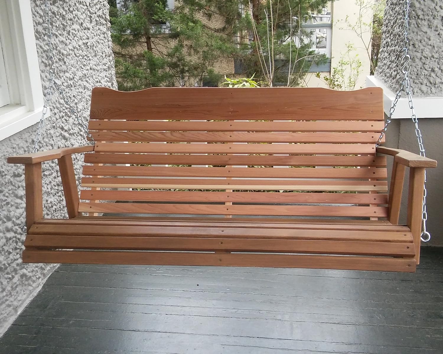The Western Red Cedar 4’ Porch Swing seats two comfortably, measuring approx. 23" high x 50" wide x 27" deep. The seat surface is approx. 18" deep x 46" wide. This traditional natural wood swing comes with comfortable contoured seating, chain and springs. All the swing needs is a view. Our lawn and garden furniture is shipped partially assembled, with easy to follow instructions. All of our patio furniture products are made from natural tight knotty Western Red Cedar with non-staining hardware. Cedar is lightweight, dimensionally stable, and naturally resistant to splitting, cupping, and warping. Western Red Cedar gives our patio furniture natural strength, beauty & natural resistance to the elements. Weight capacity is 550 lbs. Are you thinking that your porch may not be right for a swing? Please take a look at our compact self-contained cedar gliders. We also offer a 5' version of our swing, and stained cedar swings as well. Each piece is ready for staining, clear finish or simply leave natural. An oil or clear finish with UV light protection will bring out the beauty of the grain and a bit of red tinges in the wood. If the cedar is left natural, it will weather to an unpretentious gray. very traditional rustic look can be done with polyurethane with UV light protection. Clear finishes will slightly darken the wood while bringing out the red tinges found in the grain. Stains are easy to apply, can come in almost any color and do look great. Stains don't chip or peel as can happen with paint. You should apply a finish that will waterproof the wood, and prevent water spots & stains from ruining the look of the wood. Please consult your local paint expert. Some additional sanding may be required, depending on your tastes and the finish that you wish to apply. We ship by UPS ground only within the Continental US – we don’t ship to Alaska, Hawaii nor outside the United States. Shipping is added to all furniture orders.