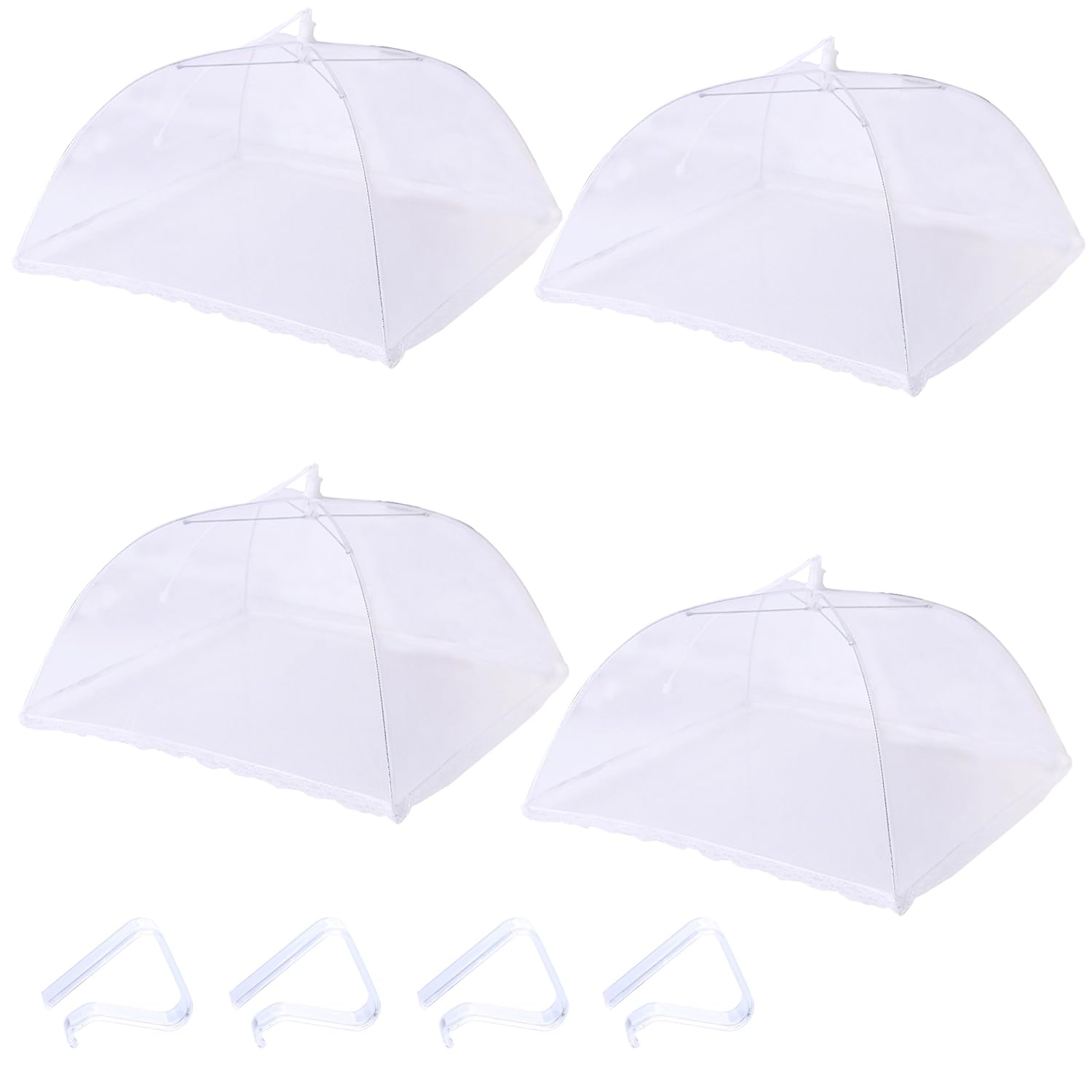 - 4 Pop Up Food Covers and 4 Tablecloth Clamps:Whether you’re hosting a pool party, camping,picnic or getting ready for a BBQ,you won’t have to worry that an insect invasion will ruin your beautiful spread.What's more,we send 4 tablecloths clamps to make your picnic more perfect. Don't let the tablecloth escape