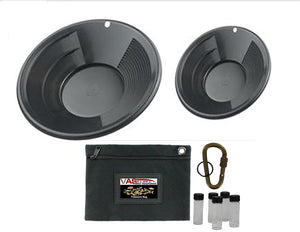 2 Dual Riffle Black Gold Pans | 12" Gold Pan | 10" Gold Pan | Treasure Bag and 5 Glass Gold Vials