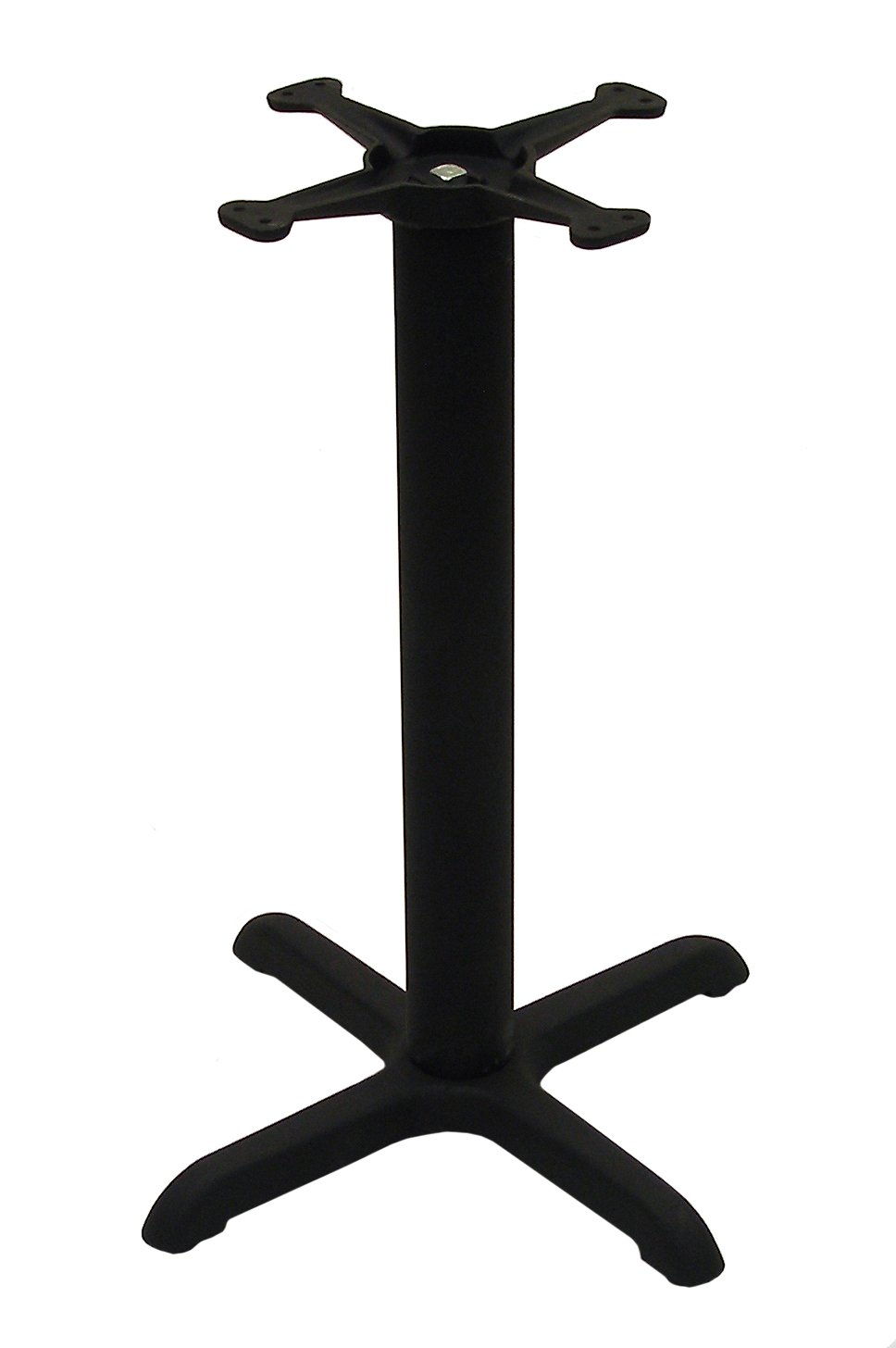 Cast iron with black wrinkle epoxy powder coat. "Generic" base, manufactured in cast-iron with a steel column. Fits up to 32-inch square/32-inch diameter table tops. Made for long life indoor commercial use. Dimensions: 22-inch x 22-inch x 28-inch.