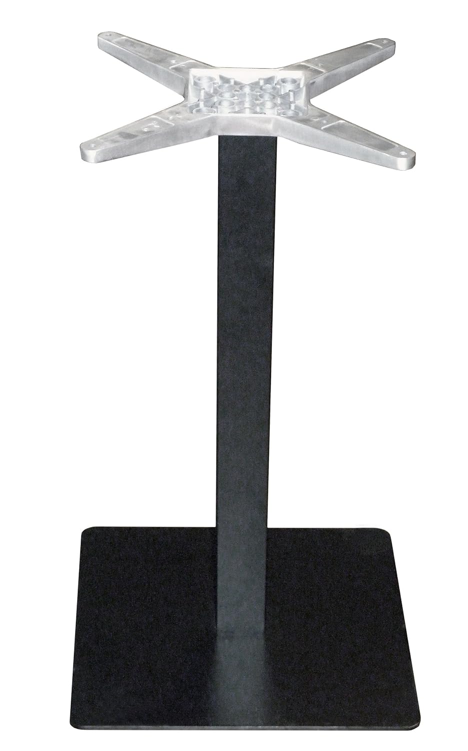 Galvanized steel plate and column, double powder coated black for protection. Can be used outdoors with minimum maintenance. Adds a contemporary look to your restaurant tables. Indoor or outdoor use. Fits up to 36-inch square/48-inch round table tops. Stainless steel columns with cast aluminum spyder and adjustable glides. Dimensions: 20-inch x 20-inch x 40-inch.