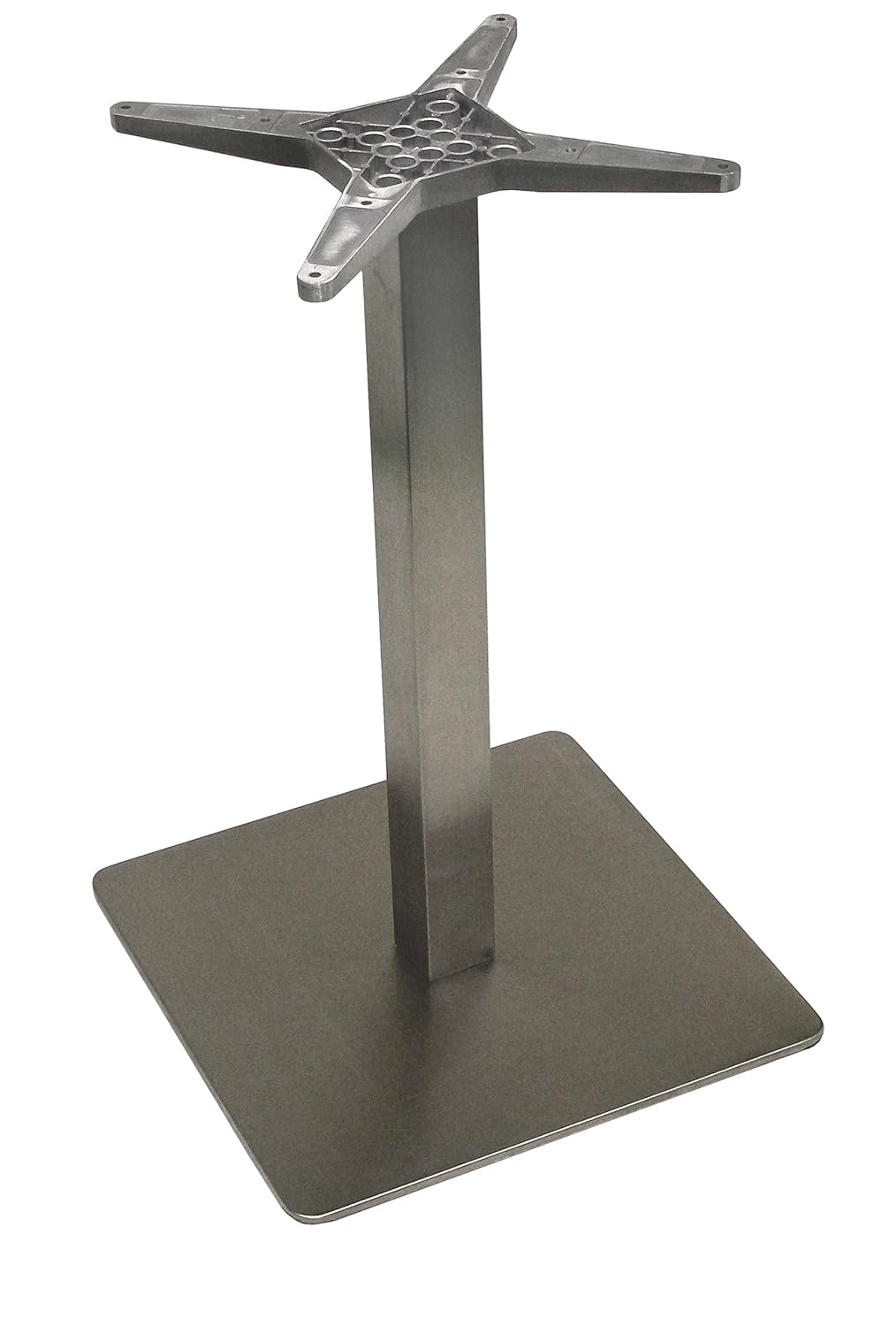 Brushed #201 stainless steel cladding affixed to a powder-coated steel plate. Can be used outdoors with minimum maintenance. Adds a contemporary look to your restaurant tables. Indoor or outdoor use. Fits up to 36-inch square/48-inch round table tops. Stainless steel column with cast aluminum spyder and adjustable glides. Dimensions: 20-inch x 20-inch x 28-1/2-inch.
