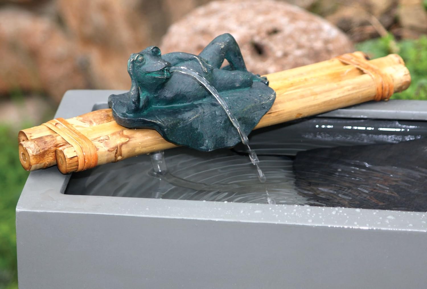 Bamboo Accents Zen Garden Water Fountain Spout, 12 Inch Base with Frog Figurine, Includes Submersible Pump Kit, Great for Outdoor Relaxation.
