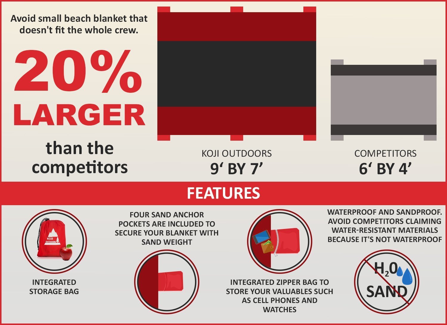 • ★ USE IT EVERYWHERE: This sand-free beach mat is not just for the beach, it can be use for picnics, soccer games, or hiking. This giant, extra large picnic blanket is a perfect portable ground cover for any outdoor getaway. You can use this red beach blanket to protect the whole family, cover the seats or trunk of your car when the need arise. Leave this compact outdoor blanket in the trunk of your car in case you need a protective cover. The best beach blanket in the market.
