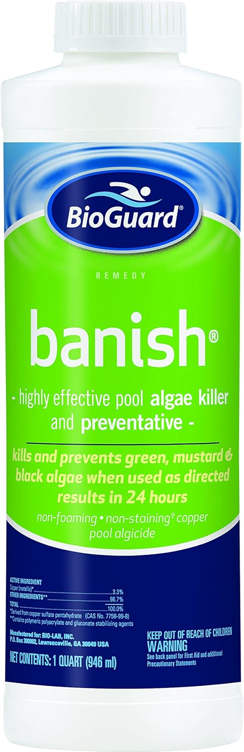 Banish is a fast-acting, highly effective, patented, non-foaming algicide that produces results in 24 hours! It kills all types of algae in swimming pools. Thanks to a patented chelant, Banish also prevents staining that commonly occurs with other copper-based algicides. Product Information: 3.3% copper pH 2.4 Highly effective pool algae destroyer and preventative Fast-acting formula produces results in 24 hours (when used in conjunction with BioGuard Shocks) Patented non-staining, non-foaming formula Kills and prevents green, mustard and black algae Works in chlorine and bromine pools Does not affect pH so pH adjustments are unnecessary after treatment. Directions for use: To prevent pool algae 1. Adjust pH to between 7.2-7.6 2. Establish and maintain proper chlorine or bromine levels 3. Vacuum leaves and other debris from your swimming pool 4. Initially apply 8 fluid ounces of Banish per 10,000 gallons of pool water with pump and filter operating 5. Thereafter, for weekly application intervals, add 1.5 fluid ounces per 10,000 gallons of pool water. For two week application intervals, add 3 fluid ounces per 10,000 gallons of pool water every other week. 6. Apply more often if pool volume is diluted by heavy rain, frequent backwashing, or partial drain/refill. Treatment of visible pool algae: 1. Add 1 pound of BioGuard Burn Out Extreme per 10,000 gallons of pool water or 1 pound of Burn Out Extreme 35 per 6,000 gallons of pool water or 1 pound of BioGuard Smart Shock per 12,000 gallons of pool water. Follow application directions for these products.
